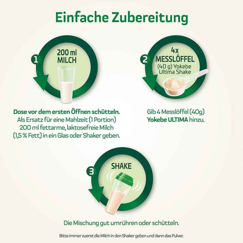 Die Dose vor dem ersten Öffnen schütteln. Als Ersatz für eine Mahlzeit (1 Portion) werden 4 Messlöffel (40 g) Yokebe Ultima in 200 ml fettarme lactosefreie Milch (1,5 %) eingerührt. Bitte geben Sie immer zuerst die Milch in das Glas oder den Shaker und dann das Pulver. Die Mischung gut umrühren oder schütteln.