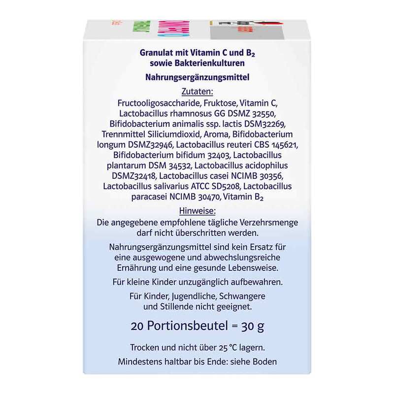 Fructooligosaccharide, Fruktose, Vitamin C, Lactobacillus rhamnosus GG DSMZ 32550, Bifidobacterium animalis ssp. lactis DSM32269, Trennmittel Siliciumdioxid, Aroma, Bifidobacterium longum DSMZ32946, Lactobacillus reuteri CBS 145621, Bifidobacterium bifidum 32403, Lactobacillus plantarum DSM 34532, Lactobacillus acidophilus DSMZ32418, Lactobacillus casei NCIMB 30356, Lactobacillus salivarius ATCC SD5208, Lactobacillus paracasei NCIMB 30470, Vitamin B2.