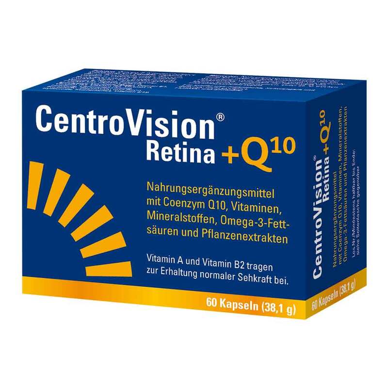 Die Inhaltsstoffe in CentroVision® Retina + Q10 wurden sorgfältig aufeinander abgestimmt. Die Vitamine A und B2 tragen zur Erhaltung der normalen Sehkraft bei.* Vitamin B1, B2, Niacin, B6, B12 und Vitamin C unterstützen die normale Funktion des Nervensystems, unter anderem des Sehnervs.* Zudem tragen die Vitamine B2, E und C dazu bei, die Zellen vor oxidativem Stress zu schützen.* Die Zusammensetzung wurde mit 100 mg Q10 täglich komplettiert.