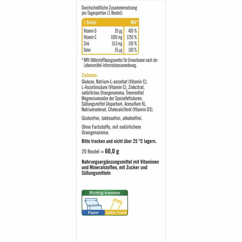 Glukose, Natrium-L-ascorbat (Vitamin C), L-Ascorbinsäure (Vitamin C), Zinkcitrat, natürliches Orangenaroma, Trennmittel Magnesiumsalze der Speisefettsäuren, Süßungsmittel (Aspartam, Acesulfam K), Natriumselenat, Cholecalciferol (Vitamin D3).