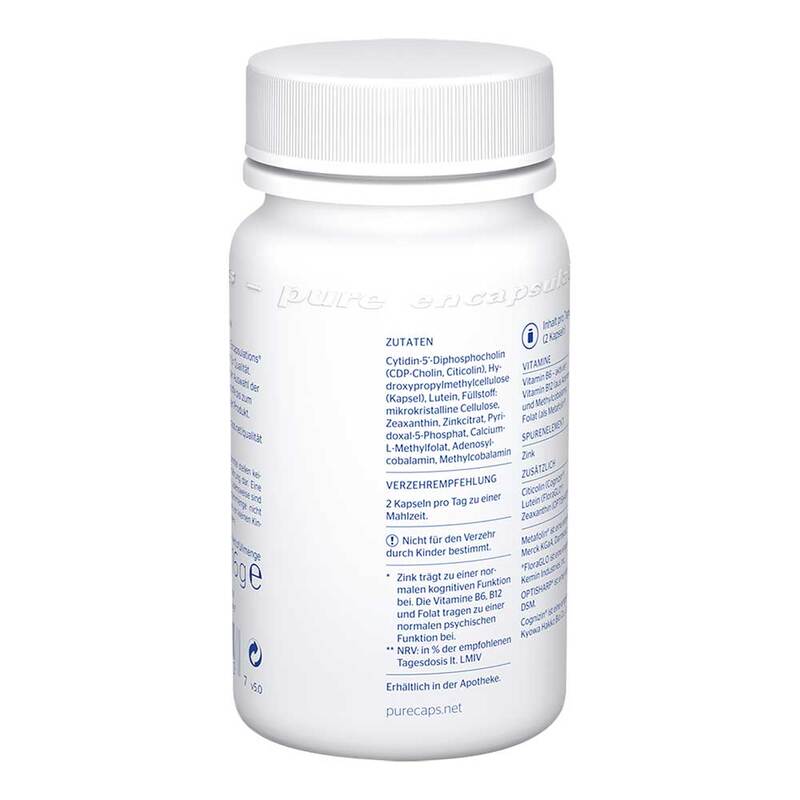 Cytidin-5-Diphosphocholin (CDP-Cholin, Citicolin), Hydroxypropylmethylcellulose (Kapsel), Lutein, Füllstoff: mikrokristalline Cellulose, Zeaxanthin, Zinkcitrat, Pyridoxal-5-Phosphat, Calcium-L-Methylfolat, Adenosylcobalamin, Methylcobalamin.