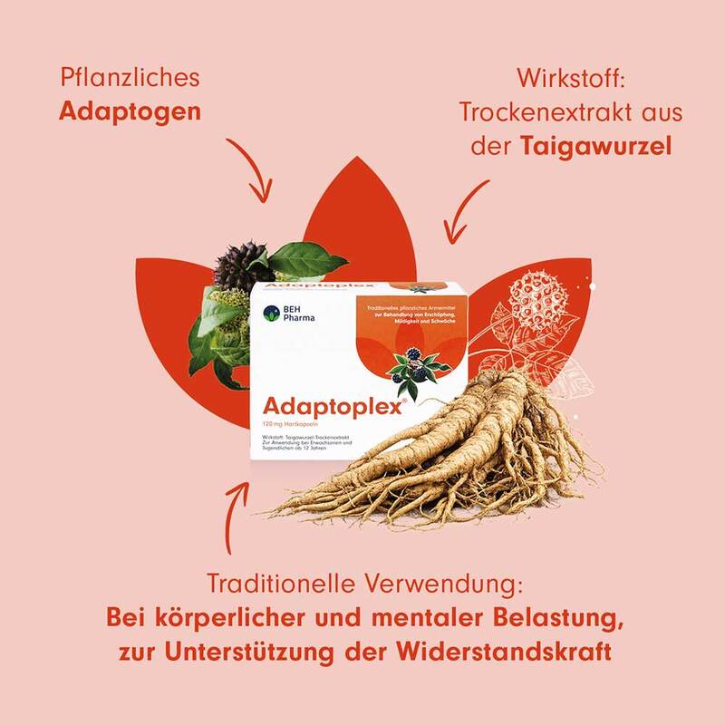 Der Wirkstoff in Adaptoplex® ist ein Trockenextrakt aus der Taigawurzel (Eleutherococcus senticosus). Diese Pflanze gehört zu den sogenannten Adaptogenen. Der Name Adaptoplex® greift genau diesen Zusammenhang auf. Adaptoplex® enthält einen 100 % pflanzlichen Wirkstoff und basiert auf einer Pflanze, die in Asien seit langer Zeit in der traditionellen Anwendung genutzt wird.