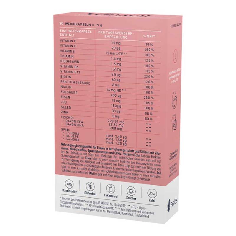 * Folat hat eine Funktion bei der Zellteilung. Folat trägt zum Wachstum des mütterlichen Gewebes während der Schwangerschaft bei. Die ergänzende Aufnahme von Folsäure/Folat erhöht bei Schwangeren den Folatspiegel; Ein niedriger Folatspiegel ist bei Schwangeren ein Risikofaktor für die Entstehung von Neuralrohrdefekten beim heranwachsenden Fötus; Die positive Wirkung stellt sich bei einer ergänzenden Aufnahme von 400 µg Folsäure täglich über einen Zeitraum von mindestens einem Monat vor und bis zu drei Monaten nach der Empfängnis ein. Die mütterliche Zufuhr von DHA trägt zur normalen Entwicklung des Gehirns des Fötus und des gestillten Säuglings bei (der positive Effekt stellt sich ein, wenn 0,2 g DHA plus die empfohlene tägliche Zufuhr von Omega-3-Fettsäuren (EPA+DHA für Erwachsene, d.h. 0,25 g pro Tag) eingenommen werden). Die Aufnahme von DHA durch die Mutter trägt zur normalen Entwicklung der Augen des Fötus und des gestillten Säuglings bei (der positive Effekt setzt ein, wenn 0,2 g DHA plus die empfohlene tägliche Zufuhr von Omega-3-Fettsäuren (EPA+DHA) für Erwachsene, die 0,25 g pro Tag beträgt, eingenommen werden). Selen trägt zu einer normalen Funktion des Immunsystems bei. Selen trägt dazu bei, die Zellen vor oxidativem Stress zu schützen. Selen trägt zu einer normalen Schilddrüsenfunktion bei. Selen trägt zur Erhaltung normaler Haare bei. Selen trägt zur Erhaltung normaler Nägel bei. Zink trägt zu einer normalen Funktion des Immunsystems bei. Zink trägt dazu bei, die Zellen vor oxidativem Stress zu schützen. Zink hat eine Funktion bei der Zellteilung. Zink trägt zu einer normalen kognitiven Funktion bei. Zink trägt zu einem normalen Stoffwechsel von Makronährstoffen bei. Jod trägt zu einem normalen Energiestoffwechsel bei. Jod trägt zur Erhaltung normaler Haut bei. Jod trägt zu einer normalen Produktion von Schilddrüsenhormonen und zu einer normalen Schilddrüsenfunktion bei. Jod trägt zu einer normalen Funktion des Nervensystems bei. Jod trägt zu einer normalen kognitiven Funktion bei. Eisen trägt zu einer normalen Funktion des Immunsystems bei. Eisen trägt zu einem normalen Energiestoffwechsel bei. Eisen hat eine Funktion bei der Zellteilung. Eisen trägt zur normalen Bildung von roten Blutkörperchen und Hämoglobin bei. Eisen trägt zu einem normalen Sauerstofftransport im Körper bei. Eisen trägt zur Verringerung von Müdigkeit und Ermüdung bei. Eisen trägt zu einer normalen kognitiven Funktion bei.