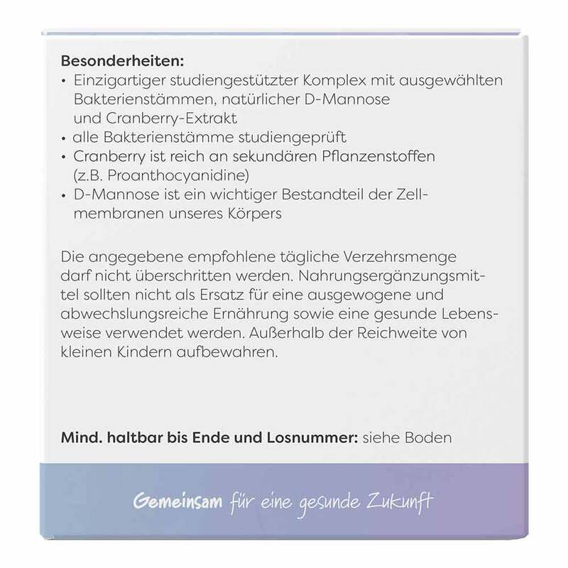 - studiengestützter Komplex mit ausgewählten Bakterienstämmen, natürlicher D-Mannose und Cranberry-Extrakt