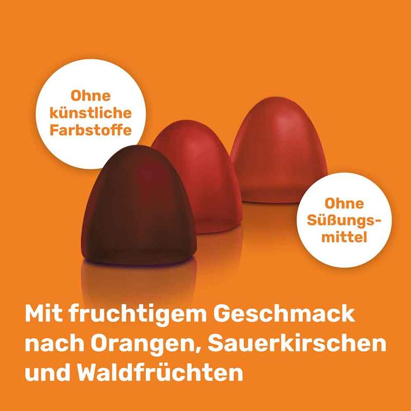 Glukosesirup, Saccharose, Wasser, Gelatine (Rind), Vitamin C (L-Ascorbinsäure), Sonnenhutextrakt (Echinacea purpurea, Kraut), Säureregulator Citronensäure; Vitamin E (DL-alpha-Tocopherylacetat), Zink (Zinkcitrat), Niacin (Nicotinamid), Pantothensäure (Calcium-D-pantothenat), Vitamin A (Retinylacetat), Mangan (Maganchlorid), Vitamin B12 (Cyanocobalamin), Vitamin D (Colecaliferol), Vitamin B6 (Pyridoxinhydrochlorid), Thiamin (Thiaminhydrochlorid), Folsäure (Pteroylmonoglutaminsäure), Jod (Kaliumiodid), Selen (Natriumselenit), Biotin (D-Biotin), färbendes Lebensmittelkonzentrat: schwarze Karotte, Farbstoffe: Pflanzenkohle und Paprikaextrakt; Aroma, Maltodextrin, pflanzliches Öl (Kokosöl), Überzugsmittel: Carnaubawachs.