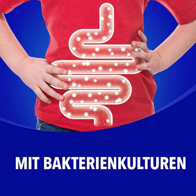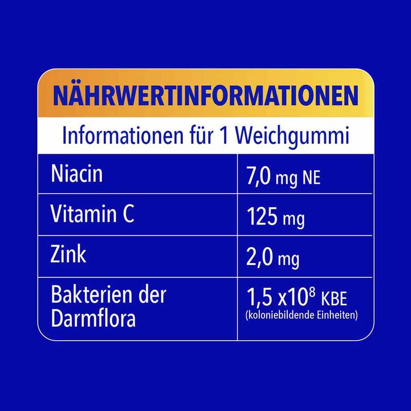Füllstoff: Sorbit; Calciumcarbonat; Maltodextrin; Stärke; Vitamin C (Calcium-L-ascorbat); Trennmittel: Mono- und Diglyceride von Speisefettsäuren; Färbendes Lebensmittel: Konzentrat aus Rote Beete; Säureregulator: Äpfelsäure; Trennmittel: Magnesiumsalze der Speisefettsäuren; Eisenfumarat; Vitamin E (DL-α-Tocopherylacetat); Niacin (Nicotinamid); Glukosesirup; Modifizierte Stärke; Zinkoxid; Pantothensäure (Calcium-D-pantothenat); Bakterien der Darmflora Lactobacillus gasseri PA 16/8, Bifidobacterium bifidum MF 20/5, Bifidobacterium longum SP 07/3 (Kann Spuren von Milch, Fisch und Soja enthalten); Emulgator: Gummi arabicum; Vitamin B6 (Pyridoxinhydrochlorid); Vitamin B1 (Thiaminmononitrat); Säureregulator: Citronensäure; Himbeeraroma; Vitamin B2 (Riboflavin); Zucker; Vitamin A (Retinylacetat); Süßungsmittel: Acesulfam K, Natriumsaccharin; Folsäure (Pteroylmonoglutaminsäure); Biotin (D-Biotin); Vitamin D (Cholecalciferol); Vitamin B12 (Cyanocobalamin).