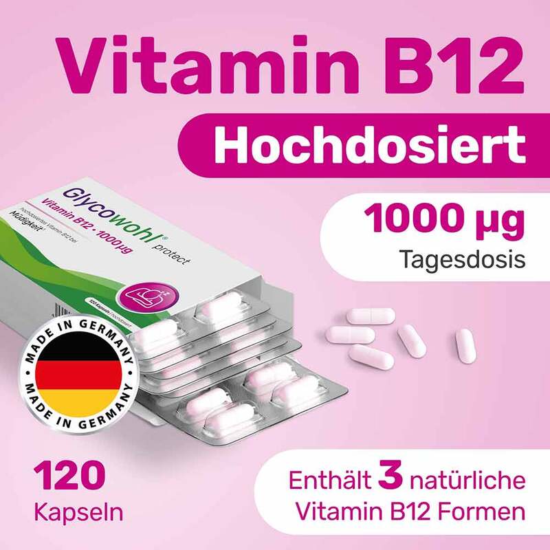 Glycowohl protect Vitamin B12 1000 µg ist ein veganes Nahrungsergänzungsmittel und enthält hochdosiertes Vitamin B12 in Apothekenqualität. Die 1000 μg setzen sich dabei aus den drei natürlichen Vitamin B12 Formen Methylcobalamin, Adenosylcobalamin und Hydroxocobalamin zusammen.