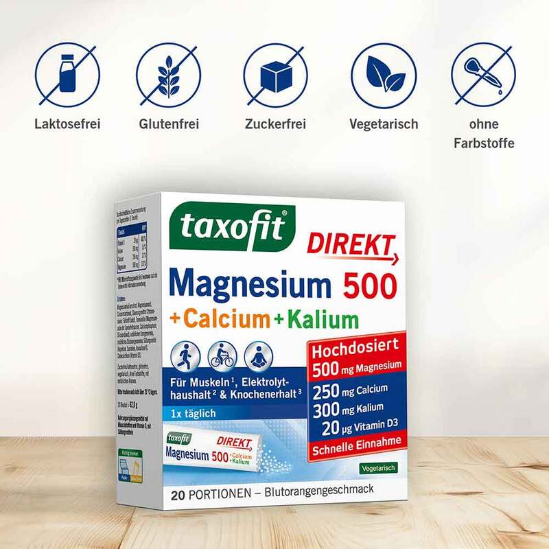 Körperlich aktive Menschen können durch einen verstärkten Muskelaufbau und höheren Energieverbrauch einen erhöhten Bedarf an Vitaminen und Mineralstoffen haben. taxofit® Magnesium 500 + Calcium + Kalium DIREKT enthält daher ausgewählte Mikronährstoffe zur Unterstützung der Muskelfunktion, des Elektrolythaushaltes, der Erhaltung normaler Knochen und des Energiestoffwechsels.* Das Direkt Granulat ermöglicht eine schnelle Aufnahme und ist leicht einzunehmen. Besonders praktisch für unterwegs und ganze ohne Wasser.