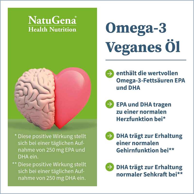 * DHA trägt zur Erhaltung einer normalen Gehirnfunktion bei. Die positive Wirkung setzt bei einer täglichen Aufnahme von 250 mg DHA ein. DHA trägt zur Erhaltung normaler Sehkraft bei. Die positive Wirkung setzt bei einer täglichen Aufnahme von 250 mg DHA ein. EPA und DHA tragen zu einer normalen Herzfunktion bei. Die positive Wirkung setzt bei einer täglichen Aufnahme von 250 mg EPA und DHA ein.