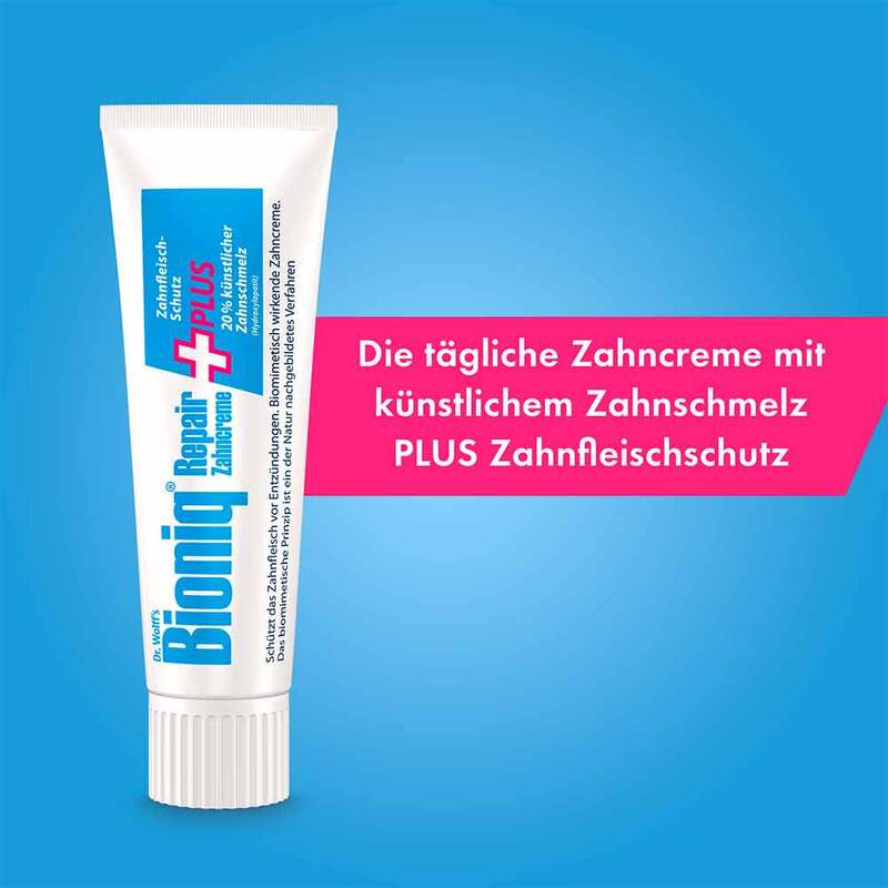 Die Bioniq® Repair-Zahncreme Plus verbindet die schützende Wirkung für den Zahnschmelz mit einem dreifachen Schutz für das Zahnfleisch: