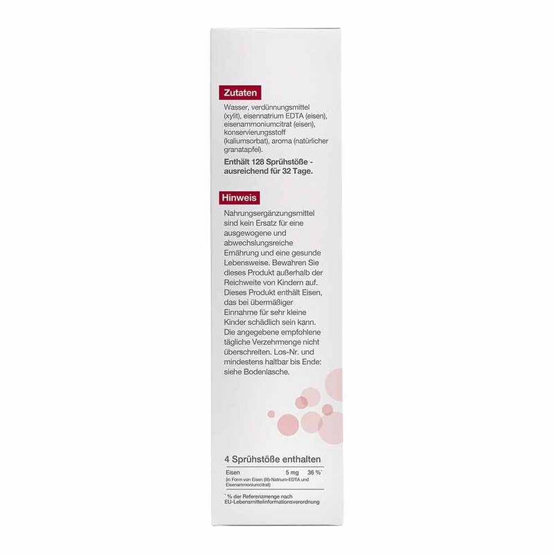 Wasser, Verdünnungsmittel (Xylit), Eisennatrium EDTA (Eisen), Eisenammoniumcitrat (Eisen), Konservierungsstoff (Kaliumsorbat), Aroma (natürlicher Granatapfel).