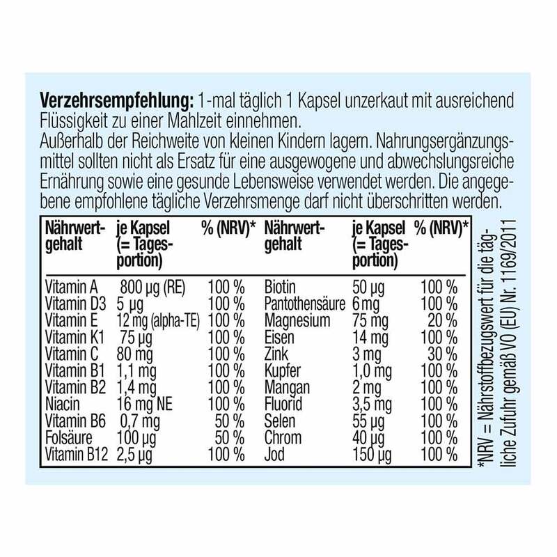 * Kupfer, Eisen, Selen, Vitamin A, B12, B6, C, D und Zink tragen zu einer normalen Funktion Ihres Immunsystems bei. Eisen, Magnesium, Niacin, B2, B12, B6 und Vitamin C tragen dazu bei, Müdigkeit und Ermüdung zu reduzieren. Vitamin B3, B6, B12 sowie Magnesium tragen zu einer normalen psychische Funktion bei. Biotin, Kupfer, Magnesium, Niacin, Vitamin B2, B6 und B12 tragen zu einer normalen Funktion des Nervensystems und zu einem normalen Energiestoffwechsel bei. Biotin, Zink, Jod, Niacin, Vitamin B2 und A tragen bei zur Erhaltung normaler Haut. Biotin, Selen, Zink tragen bei zur Erhaltung normaler Haare. Kupfer, Selen, Zink, Vitamin B2 und Vitamin C tragen dazu bei, die Zellen vor oxidativem Stress zu schützen. Kupfer trägt bei zu einer normalen Haarpigmentierung, zur Erhaltung von normalem Bindegewebe und zu einer normalen Hautpigmentierung. Selen und Zink tragen zur Erhaltung normaler Nägel bei. Kalzium, Magnesium und Vitamin D tragen zur Erhaltung normaler Muskelfunktionen, normaler Knochen und Zähne bei. Vitamin C trägt zu einer normalen Kollagenbildung für eine normale Funktion der Knochen, der Knorpelfunktion, der Zähne, des Zahnfleisches und der Haut bei. Zink trägt bei zur normalen Funktion der Knochen. Zink und Vitamin A zur Erhaltung normaler Sehkraft bei. Vitamin A trägt zur Erhaltung normaler Schleimhäute bei. Zink trägt zu einer normalen Fruchtbarkeit und einer normalen Reproduktion bei. Folsäure trägt zum Wachstum des mütterlichen Gewebes während der Schwangerschaft bei. Zink trägt zur Erhaltung eines normalen Testosteronspiegels im Blut bei. Chrom und Zink tragen zu einem normalen Stoffwechsel von Makronährstoffen bei. Eisen und Jod tragen zu einem normalen Energiestoffwechsel bei. Zink trägt zu einem normalen Kohlenhydrat-Stoffwechsel bei.