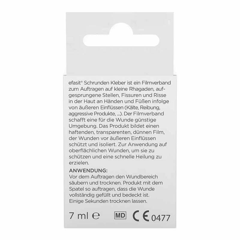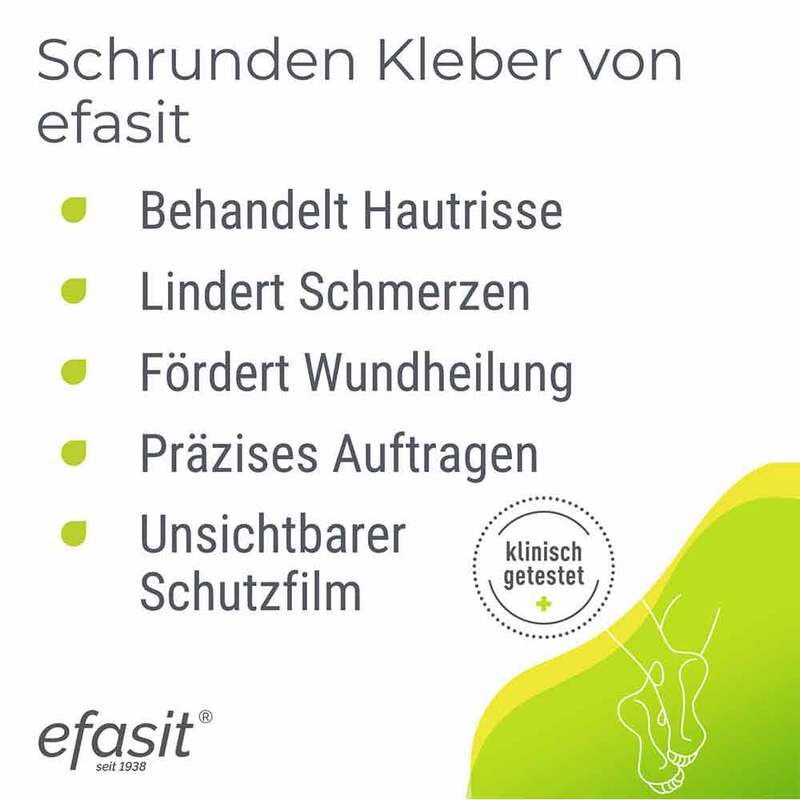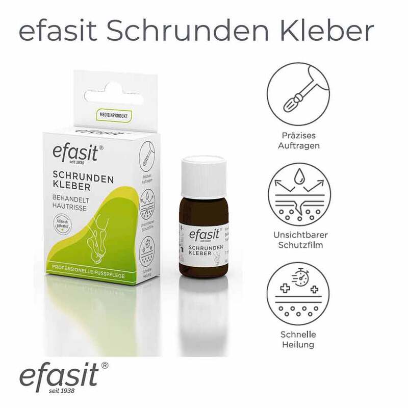 Efasit Schrunden Kleber ist ein Filmverband zum Auftragen auf kleine Rhagaden, aufgesprungene Stellen, Fissuren und Risse in der Haut an Händen und Füßen infolge von äußeren Einflüssen (Kälte, Reibung, aggressive Produkte, ...). Der Filmverband schafft eine für die Wunde günstige Umgebung. Das Produkt bildet einen haftenden, transparenten, dünnen Film, der Wunden vor äußeren Einflüssen schützt und isoliert. Zur Anwendung auf oberflächlichen Wunden, um sie zu schützen und eine schnelle Heilung zu erzielen.