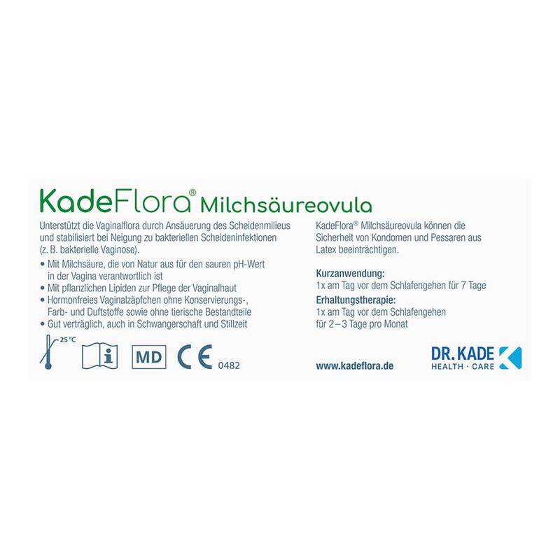 - KadeFlora Milchsäureovula sind Vaginalzäpfchen auf Basis pflanzlicher Lipide, die nach dem Einführen schmelzen und ein reichhaltigeres, cremigeres Gefühl erzeugen