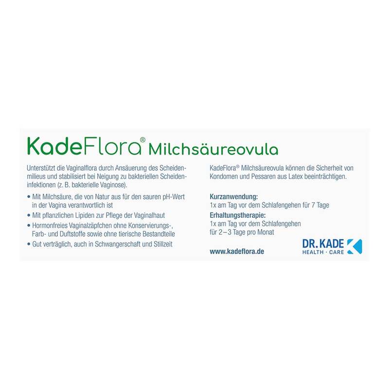 - KadeFlora Milchsäureovula sind Vaginalzäpfchen auf Basis pflanzlicher Lipide, die nach dem Einführen schmelzen und ein reichhaltigeres, cremigeres Gefühl erzeugen