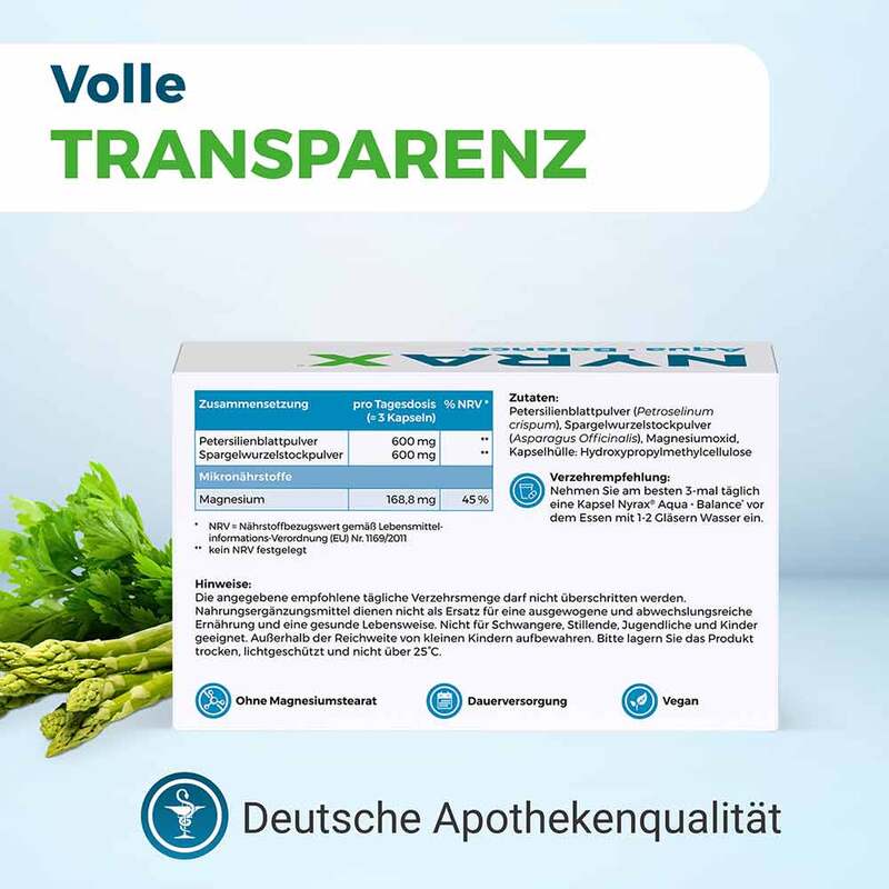 Petersilienblattpulver (Petroselinum crispum), Spargelwurzelstockpulver (Asparagus Officinalis), Magnesiumoxid, Kapselhülle: Hydroxypropylmethylcellulose