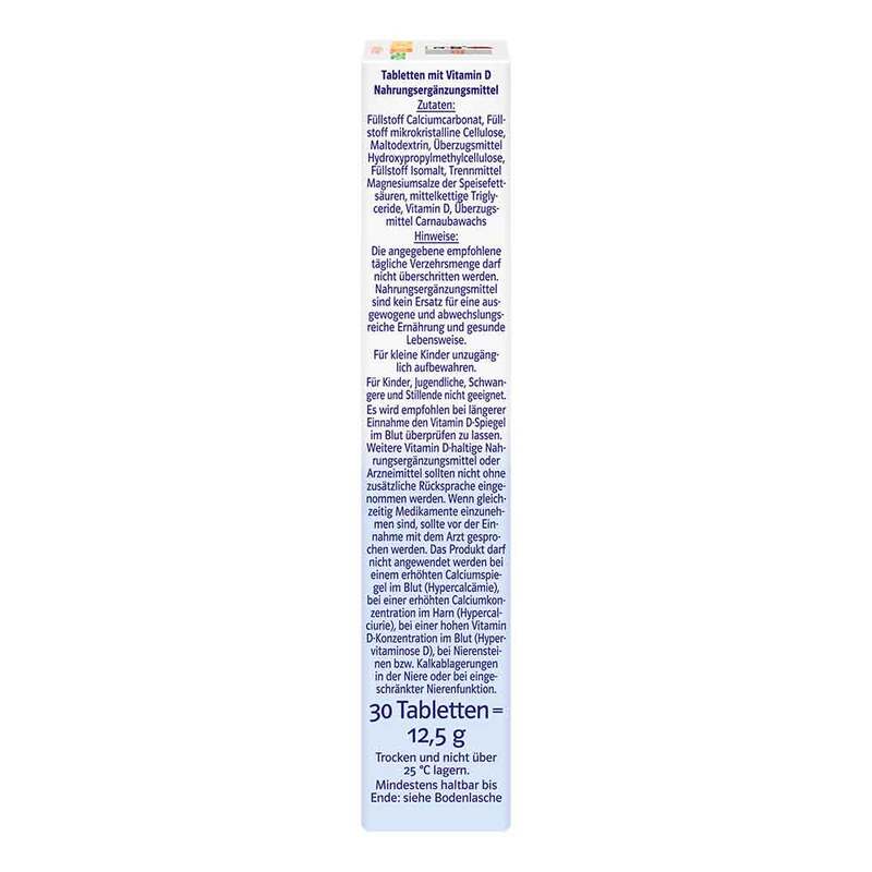 Füllstoff Calciumcarbonat, Füllstoff mikrokristalline Cellulose, Maltodextrin, Überzugsmittel Hydroxypropylmethylcellulose, Füllstoff Isomalt, Trennmittel Magnesiumsalze der Speisefettsäuren, mittelkettige Triglyceride, Vitamin D, Überzugsmittel Carnaubawachs.