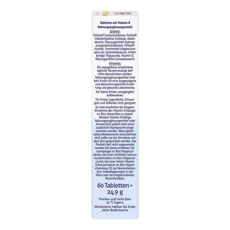 Füllstoff Calciumcarbonat, Füllstoff mikrokristalline Cellulose, Maltodextrin, Überzugsmittel Hydroxypropylmethylcellulose, Füllstoff Isomalt, Trennmittel Magnesiumsalze der Speisefettsäuren, mittelkettige Triglyceride, Vitamin D, Überzugsmittel Carnaubawachs.