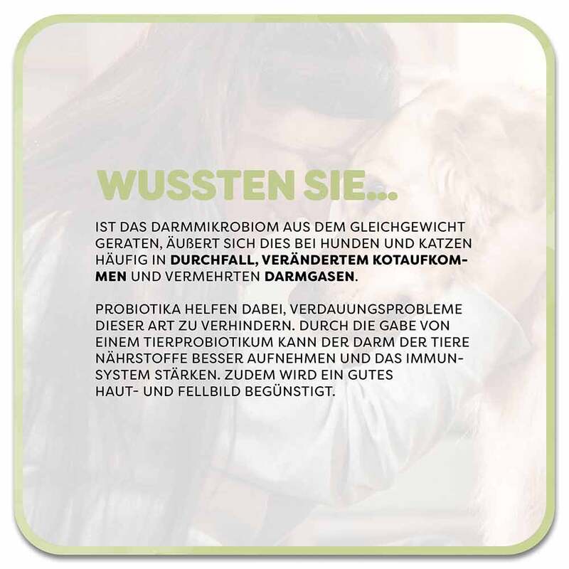 Enthält 2 ausgesuchte probiotische Bakterienkulturen in einer Gesamtkeimzahl von 1x1012 KbE+ / kg Pulver