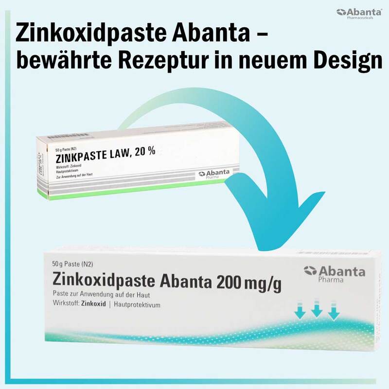 Zinkoxidpaste Abanta 200 mg/g Paste zur Anwendung auf der Haut Wirkstoff: Zinkoxid Anwendungsgebiete: Zinkoxid wirkt abdeckend-protektiv und sekretbindend bei akuten und subakuten Dermatosen. Warnhinweise: Enthält Wollwachs und Butylhydroxytoluol. Pharmazeutischer Unternehmer: Abanta Pharma GmbH, Reichsstraße 78, 58840 Plettenberg „Zu Risiken und Nebenwirkungen lesen Sie die Packungsbeilage und fragen Sie Ihre Ärztin, Ihren Arzt oder in Ihrer Apotheke.“
