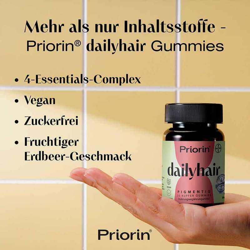 Sollten Sie es nicht schaffen, alle Nährstoffe ausreichend über die Nahrung aufzunehmen, stehen Ihnen Nahrungsergänzungsmittel wie Priorin Dailyhair Pigmentiq zur Seite. Die praktischen Gummies kombinieren vier wertvolle Nährstoffe in einem leckeren Fruchtgummi mit Erdbeergeschmack und sind jederzeit griffbereit.