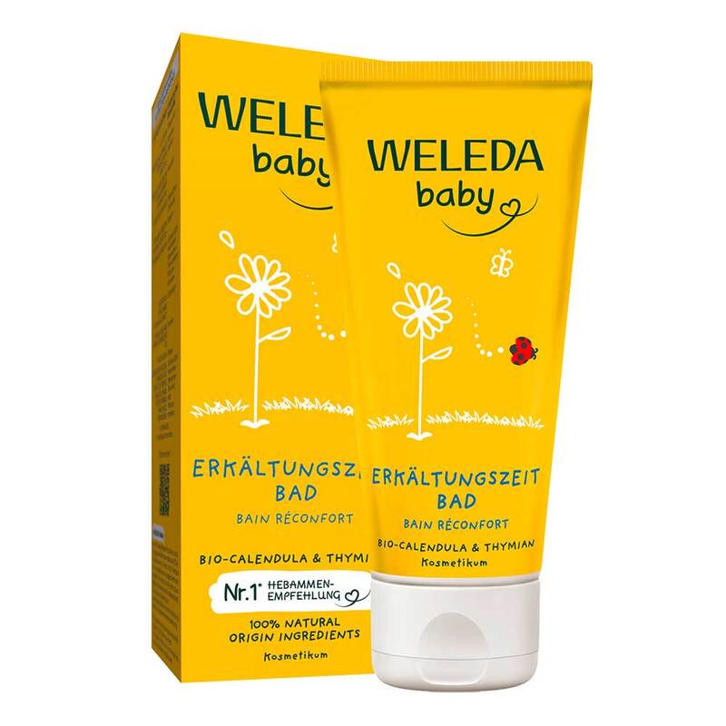 Schenken Sie Ihrem Baby in der kälteren Jahreszeit wohlige Geborgenheit mit dem Calendula Erkältungszeit Bad von Weleda Baby! Das Baden mit dem Erkältungszeit Bad entspannt und pflegt die Haut – seine extra milde Formel reinigt die Haut besonders sanft. Im durchwärmenden Bad entfaltet die Mischung mit Thymian, Latschenkiefer und Lavendel ihren angenehmen Duft. Das Bad ist geeignet für Babys ab 3 Monaten.