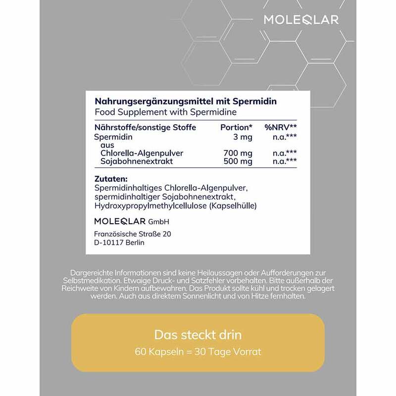 Spermidinhaltiges Chorella-Algenpulver und spermidinhaltiges Sojabohnenextrakt; Hydroxypropylmethylcellulose (Kapselhülle).