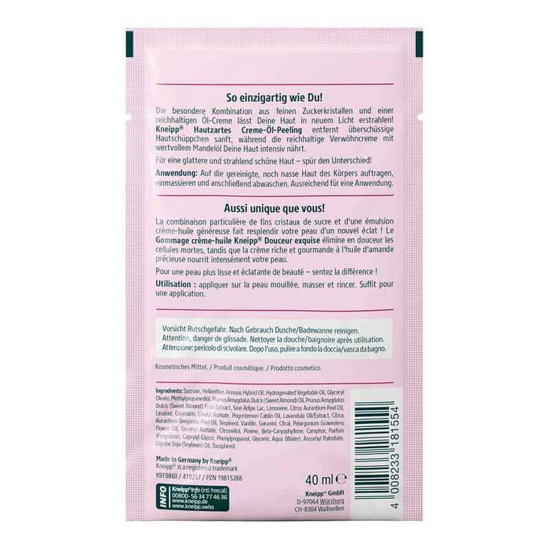 So einzigartig wie Sie! Die besondere Kombination aus feinen Zuckerkristallen und einer reichhaltigen Öl-Creme lässt Ihre Haut in neuem Licht erstrahlen! Kneipp Hautzartes Creme-Öl-Peeling entfernt überschüssige Hautschüppchen sanft, während die reichhaltige Verwöhncreme mit wertvollem Mandelöl Ihre Haut intensiv nährt. Für eine glattere und strahlend schöne Haut spür den Unterschied!- Sanftes Zuckerpeeling und Öl-Creme für gepflegte Haut als Einmalanwendung