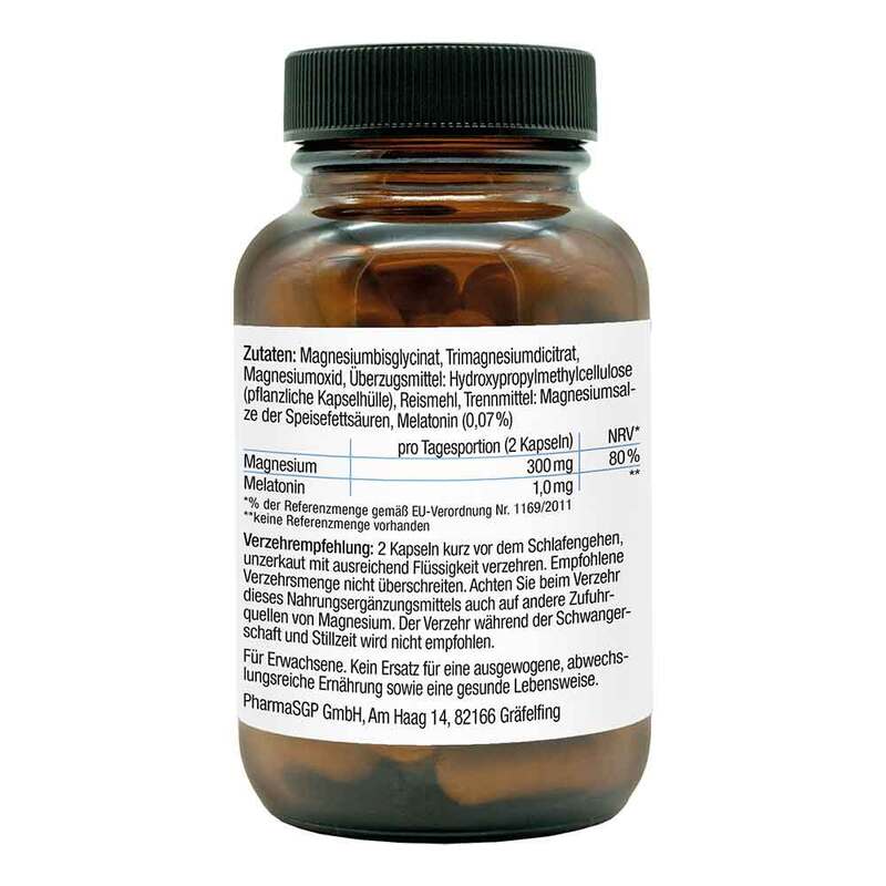 Magnesiumbisglycinat, Trimagnesiumdicitrat, Magnesiumoxid, Überzugsmittel: Hydroxypropylmethylcellulose (pflanzliche Kapselhülle), Reismehl, Trennmittel: Magnesiumsalze der Speisefettsäuren, Melatonin (0.07%).