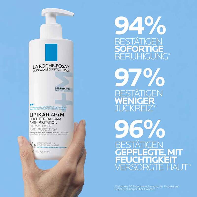 Die La Roche Posay Lipikar leichter Balsam AP+M Bodylotion für juckende, trockene und zu Neurodermitis neigende Haut einmal am Tag nach der Reinigung auf den Körper auftragen. Anschließend sanft in die Haut einmassieren. Die schnell einziehende Creme für juckende Haut zieht in weniger als einer Minute in die Haut ein und mildert die Anzeichen von Juckreiz, Trockenheit sowie Spannungsgefühle der Haut.