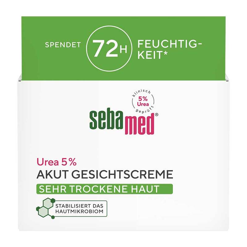 Die sebamed Akut Gesichtscreme mit 5% Urea spendet nachweislich 72 Stunden Feuchtigkeit.* Eignet sich auch therapiebegleitend für die Hautpflege bei Neurodermitis, Schuppenflechte und Diabetes. Stabilisiert das Hautmikrobiom. Pflegetipp: sebamed Akut Lotion
