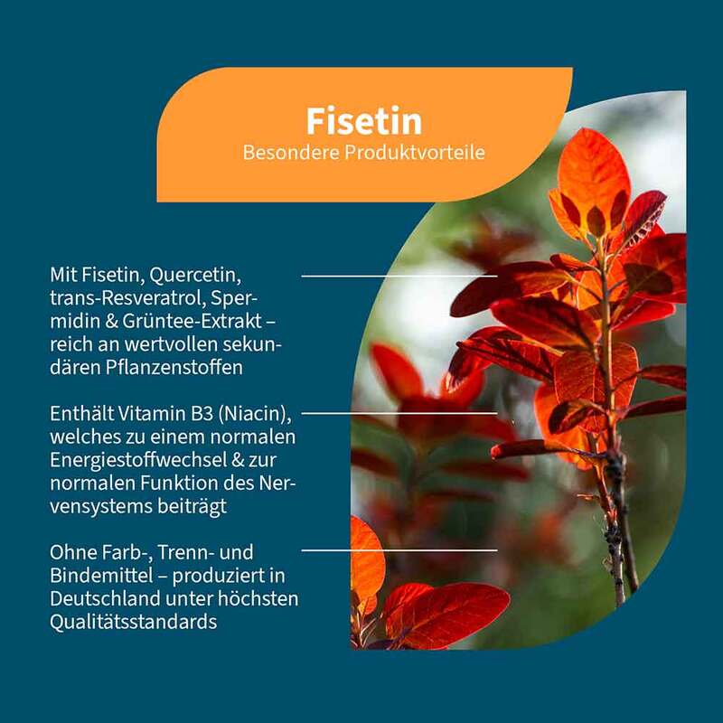 • enthält pflanzliche Stoffe wie Fisetin, Spermidin, Quercetin, trans-Resveratrol und Grüntee-Extrakt