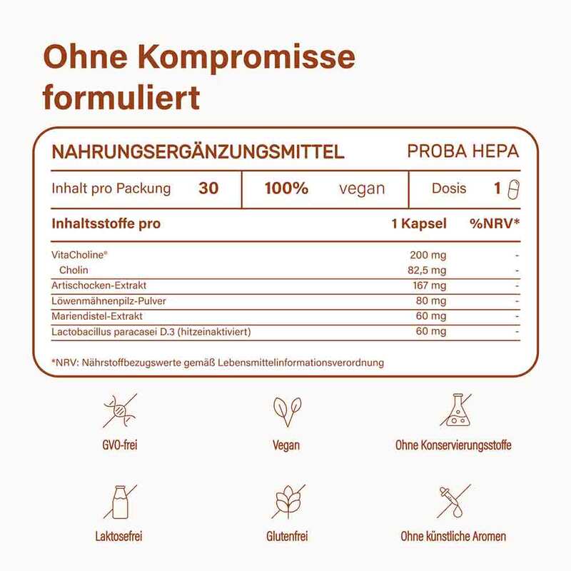 Cholinbitartrat, Artischockenblattextrakt (Cynara scolymus L.) mit 10% Cynarin, Hydroxypropylmethylcellulose (Kapselhülle), Igelstachelbart-Fruchtpulver (Hericium erinaceus (Bull.) Persoon), Maisstärke, Mariendistel-Samenextrakt (Silybum marianum (L.) Gaertn.), Lactobacillus paracasei (wärmeinaktivierte Zellen), Trennmittel: Magnesiumsalze von Speisefettsäuren