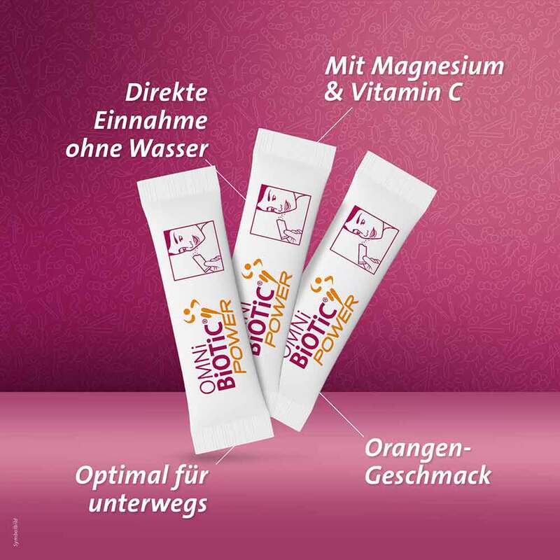 OMNi-BiOTiC® POWER Direkt-Sticks kombinieren 6 in wissenschaftlichen Studien geprüfte Bakterienstämme – zusätzlich ergänzt um Magnesium und Vitamin C = die schnelle Versorgung für Power und Immunsystem!