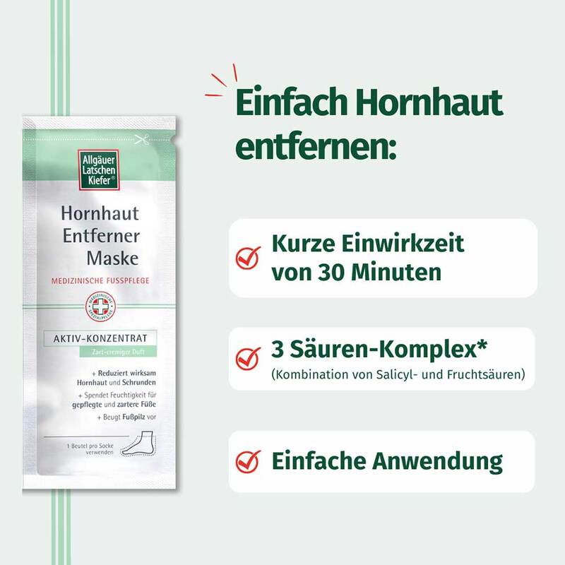 Die Hornhaut Entferner Maske von Allgäuer Latschenkiefer wurde speziell für die Pflege verhornter Fußhaut entwickelt und unterstützt eine einfache sowie angenehme Hornhautentfernung zu Hause. Die Formulierung mit einem ausgewählten Wirkstoff-Komplex mit Salicyl- und verschiedenen Fruchtsäuren, wie Milchsäure und Glykolsäure, wirkt hornlösend und sorgt so dafür, dass sich die abgestorbenen Hautzellen lösen. Auf diese Weise kann die Hornhautpflege erfolgen, ohne dass mechanische Hilfsmittel wie Raspeln oder Hobel notwendig sind.